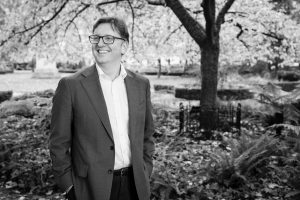 black and white professional headshot of max parylo. Max is looking off to his left and appears to be laughing.