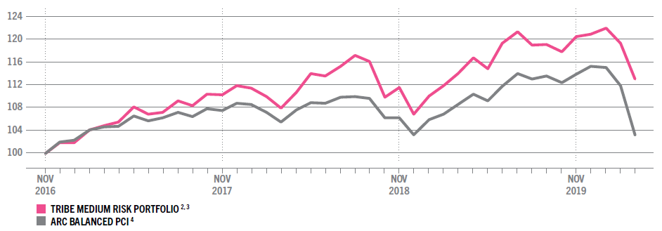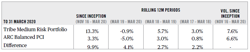 Despite the challenging market conditions, our Q1 2020 performance shows continued relative outperformance, which up until now, has been delivered in the comparatively benign environment of a pre-Covid-19 world. Our medium-risk bespoke model performance fell -6.6% in Q1, versus -10.6% for ARC 1 .