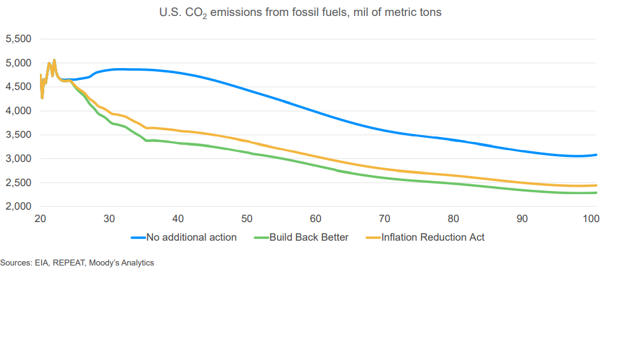 The bill aims to reduce 2030 emissions to 40% below 2005 levels. Whilst on its own, the measures won’t be enough to steer the US to meet its 2050 net zero target, it’s a recommitment to a path that was significantly derailed during the previous administration. The Inflation Reduction Act is a step in the right direction, and Moody’s estimate that total emissions will be 30% lower in 2050 than if no legislative changes occurred at all7.