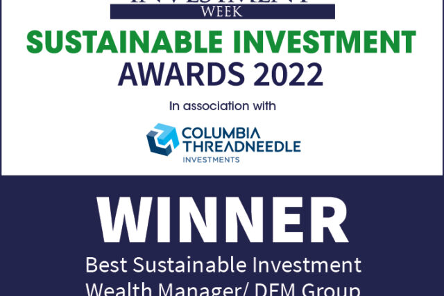 We were awarded Best Sustainable Investment Wealth Manager/DFM Group at Investment Week’s 2022 Sustainable Investment Awards. We’re delighted to have been recognised for excellence in sustainability within our investment proposition and business operations.
